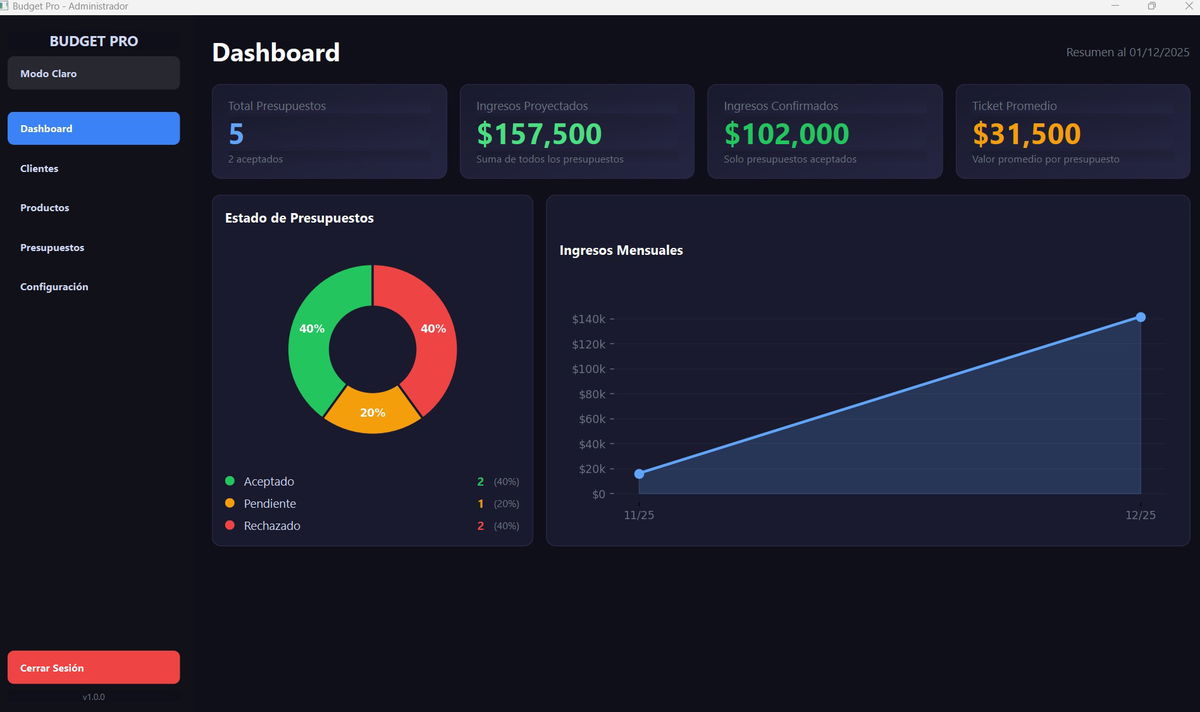 ✅ Visualizar tu rendimiento en un dashboard profesional, con métricas claras de trabajos, presupuestos, ingresos, aceptación y productividad