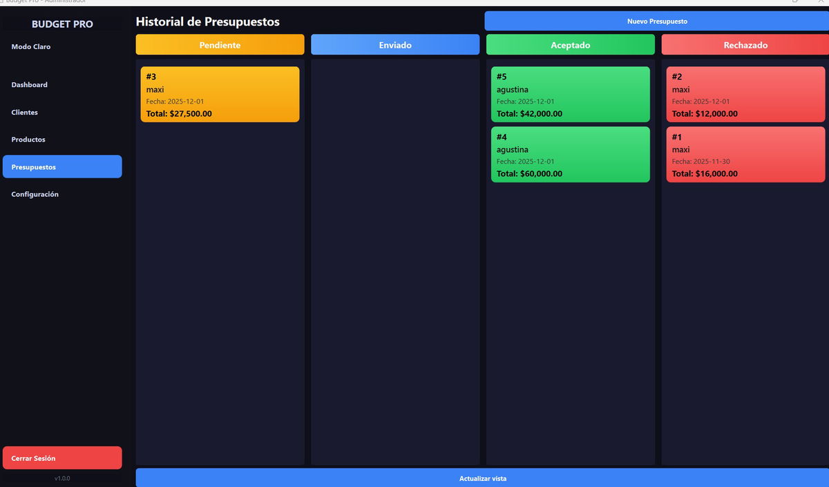 ✅ Gestionar todos tus presupuestos desde un tablero Kanban (Pendiente, Enviado, Aceptado, Rechazado, Finalizado, etc.)